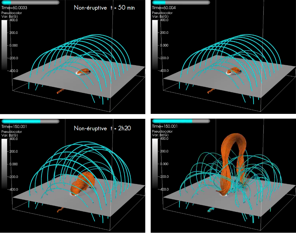 Au total, ce sont 7 simulations numériques qui ont été testées dans ce travail, dont 3 simulations conduisant à la formation de régions actives stables, i.e. non-éruptives et 4 formant des éruptions. Deux de ces simulations sont représentées en 3D sur la figure 3, dont une simulation non-éruptive (droite) et une simulation non-éruptive (gauche). L’éruption est déclenchée en fonction d’un seul paramètre, l’orientation du champ magnétique coronal initial. Pour déterminer le potentiel prédictif des paramètres testés, il faut évidemment comparer aux régions actives pour lesquelles il ne se produit pas d’éruption. Pour qu’un paramètre physique mesuré à la surface solaire soit considéré comme un bon indicateur du déclenchement d’une éruption, il faut donc qu’il présente les caractéristiques suivantes :