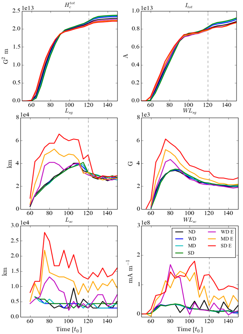 L’ensemble des paramètres testés dans le travail de Guennou et al (2017) a permis de tester une centaine de paramètres sur ces 7 simulations, en les analysant comme de vraies données, pour ne se concentrer que sur les signatures éruptives détectables uniquement à partir de magnétogrammes 2D. Les résultats montrent que pour ce type de simulations, seuls les paramètres liés à la ligne d’inversion magnétique, c’est-à-dire quand le champ magnétique vertical change de signe, présente une forte augmentation détectable avant l’éruption. Au total, sur la centaine de paramètres testés donc, seuls 6 paramètres apportent une information fonction de la nature éruptive ou non de la simulation, moyennant un pré-traitement des données rigoureux (cf. figure 4, où 4 de ces 6 paramètres sont représentés).