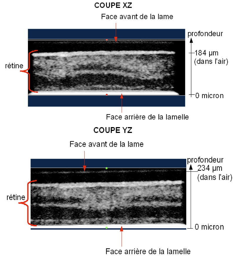 Des images de rétines explantées de rat, entre lame et lamelle, ont été obtenues sur le banc d’OCT plein champ seule. Après acquisition d’une pile d’images en-face (en XY), n’importe quelle coupe axiale (XZ ou YZ) peut être extraite des données.