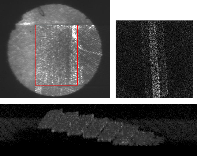 En haut à gauche : une des quatre images interférométriques acquises par la caméra CCD ; toutes les marches de l’escalier sont visibles (dans le carré rouge), il n’y a pas l’information en profondeur sans traitement OCT. En haut à droite : une coupe tomographique à une profondeur donnée (reconstruite à partir des quatre images interférométriques) ; on y voit la marche dont la profondeur est à l’égalité optique entre les bras de l’interféromètre, ainsi que les deux marches voisines de part et d’autre, plus faibles, dont la profondeur est dans la longeur de cohérence de la source. En bas : recontruction en 3D de l’escalier à partir d’une pile de 40 coupes tomographiques acquises tous les microns.