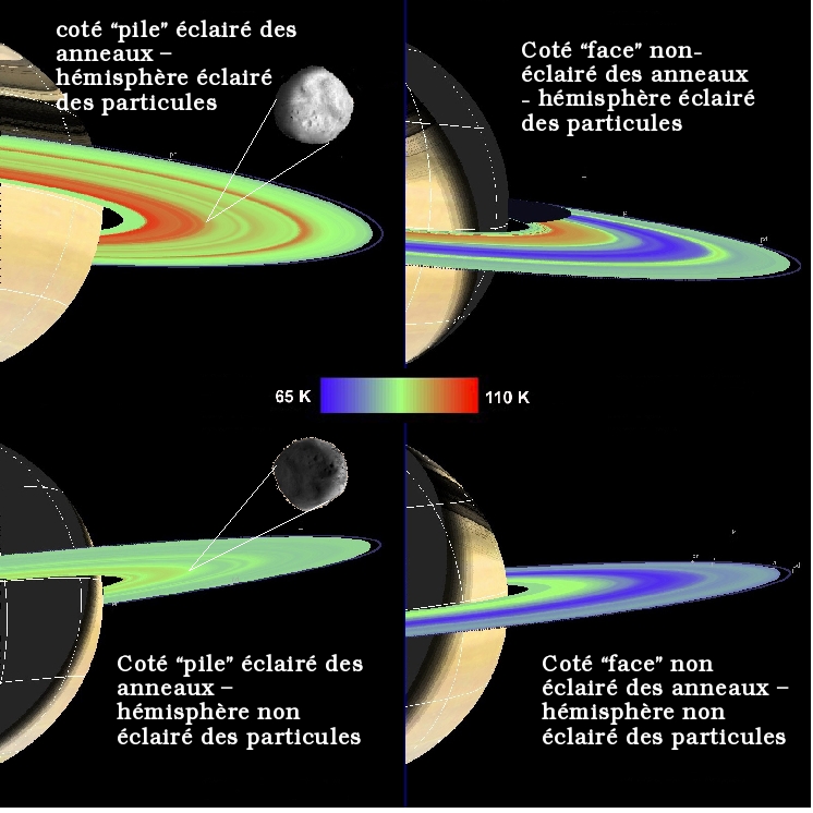 Les quatre images montrent la tempĂ©rature mesurĂ©e par CIRS sur les faces Ă©clairĂ©es ou non-Ă©clairĂ©es des anneaux, et en regardant l’hĂ©misphère cĂ´tĂ© jour ou cĂ´tĂ© nuit des particules.