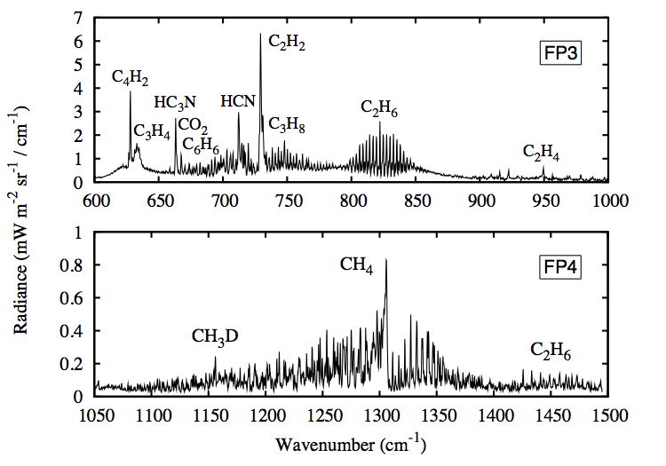 Le spectre de Titan observĂ© par CIRS fait apparaĂ®tre de nombreuses raies molĂ©culaires qui permettent de mesurer la tempĂ©rature et la composition chimique de l’atmosphère du satellite
