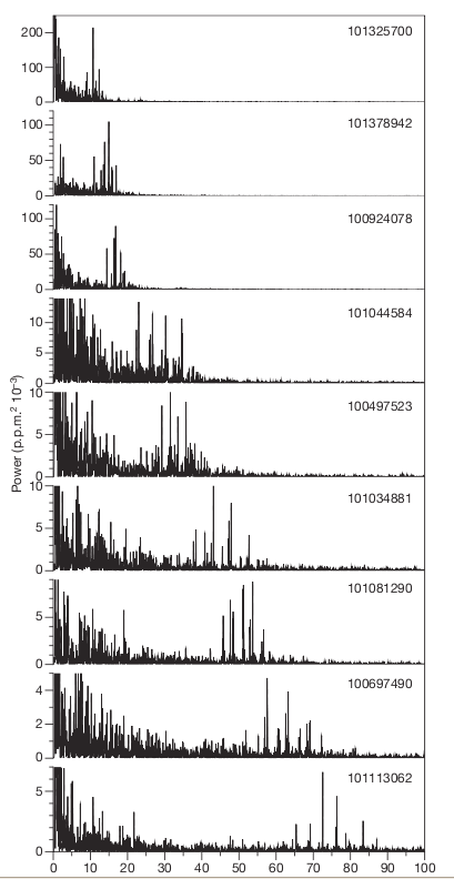 Figure 2 : Spectre de puissance de 9 étoiles candidates géantes rouges. La puissance est exprimée en partie par millions (p.p.m.) au carré et divisée par 1000. Les pics associés aux oscillations sont clairement visibles : autour de 75 microHz pour le spectre du bas et autour de 10 microHz pour celui du haut. Les nombres indiqués en haut à droite de chaque spectre correspondent à l’identifiant CoRoT de l’étoile. (cliquer sur l’image pour l’agrandir).