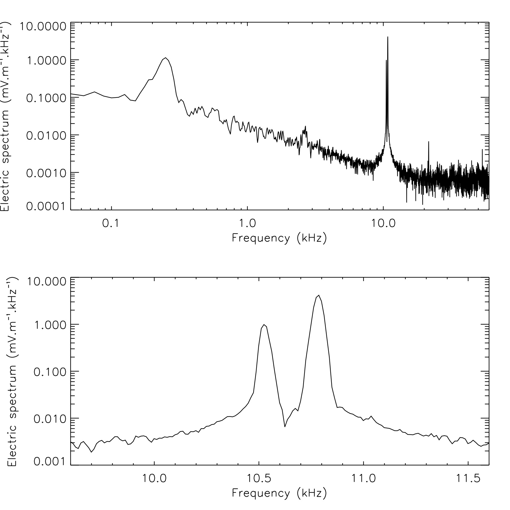 Spectre typique du champ électrostatique associé à une émission de type III. On remarque un pic à 10kHz (fréquence Langmuir) et un autre à 0.25kHz (onde acoustique ionique). Graphe inférieur : un zoom autour du pic Langmuir montre deux pics dont la séparation est égale la fréquence de l’onde acoustique ionique. Observations STEREO/WAVES
