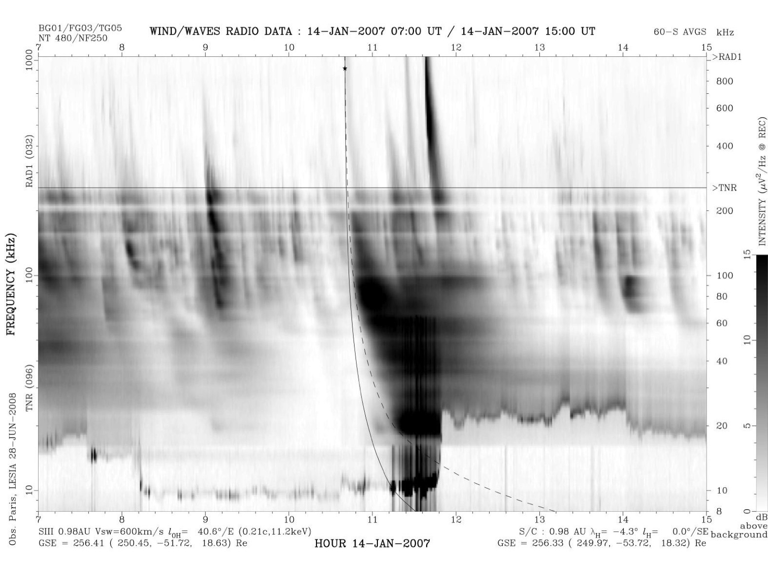 Intensité des émissions radio en fonction du temps et de la fréquence. L’émission de Type III se caractérise par une dérive dans le plan temps-fréquence (soulignée par des traits pointillés). Les émissions électrostatiques sont visibles vers 10kHz entre 11:15 et 11:45. Observations depuis le satellite WIND (NASA)