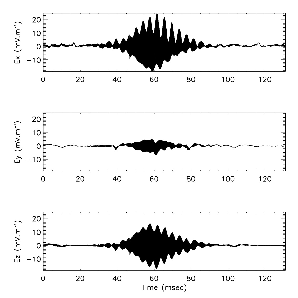 Exemple de mesure de forme d’onde. Le temps (en millisecondes) est indiqué en abscisse, l’amplitude du champ électrique est indiqué en ordonné. Chaque graphe correspond à une mesure sur une des trois antennes de STEREO/WAVES.