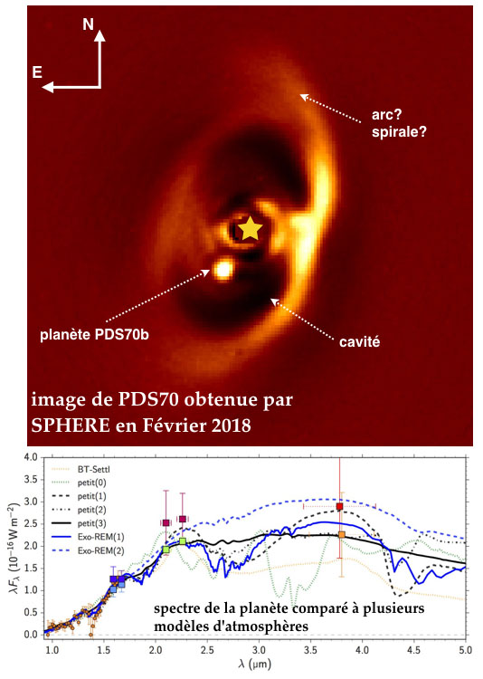L’image du haut montre la planète PDS70b située à l’intérieur de la cavité d’un disque protoplanétaire. L’étoile centrale à été supprimée par différentes techniques optiques et numériques pour permettre de voir des objets beaucoup plus faibles dans son environnement (la planète est 4500 fois plus faible que son étoile). La figure du bas présente des mesures spectroscopiques en proche IR (carrés de couleurs) comparés à plusieurs modèles d’atmosphères (lignes de couleurs).