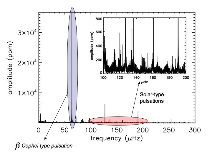 La précision sans précédent des données CoRoT nous a ainsi permis d’annoncer la détection d’oscillations de type solaire dans une étoile massive, V1449 Aql (HD180642). Cette étoile était déjà identifiée comme étant une étoile de type Beta Cephei présentant des pulsations classiques du type « kappa ». Il s’agit donc de la première étoile pulsant à la fois comme une étoile massive et comme une étoile analogue à notre Soleil. Cette découverte est illustrée sur la figure 1.