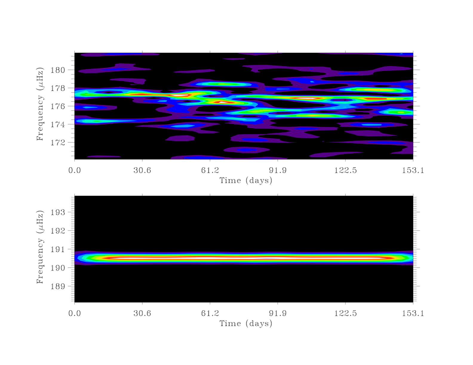 Analyse temps-fréquence de deux modes d’oscillation. Panneau supérieur : une oscillation de type solaire. Panneau inférieur : seconde harmonique du mode “kappa” dominant (63.5 µHz).