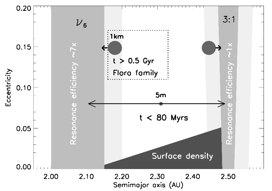 La figure 2 illustre la dynamique des petits et grands objets au sein de la ceinture principale interne. Les résonances nu-6 [2] et 3:1 apparaissent en gris foncé et leur efficacité relative ’d’envoi de matériel’ vers la Terre est mentionnée. Le carré délimité par des pointillés indique la zone (a,e) occupée par la famille de Flora. La variation moyenne du demi grand axe (en UA) due à l’effet Yarkovsky (2) est représentée par une flèche placée devant chaque objet. Pour un objet d’1km : Delta a 0.01-0.02 UA en 0.5 milliard d’années. Les zones gris claires autour des résonances indiquent les régions sources attendues pour ces NEAs. Pour un objet de 5m : Delta a 0.2 UA en moins de 80 millions d’années. L’objet peut ainsi atteindre une des 2 résonances sans aucune ’difficulté’. Enfin, la densité surfacique d’astéroïdes en fonction de la distance au Soleil est mentionnée au bas de la figure. La densité de surface plus importante près de la résonance 3 :1 permet de compenser partiellement le manque d’efficacité de cette résonance (par comparaison directe avec nu-6). En prenant en compte la densité surfacique et l’efficacité de chaque résonance, la résonance nu-6 (1) devrait être 1.5x plus efficace que la résonance 3 :1. En conclusion, les NEAs devraient majoritairement venir de la région qui borde la résonance nu-6 alors que les météorites peuvent provenir de la ceinture interne toute entière voire au delà de 2.5 UA.