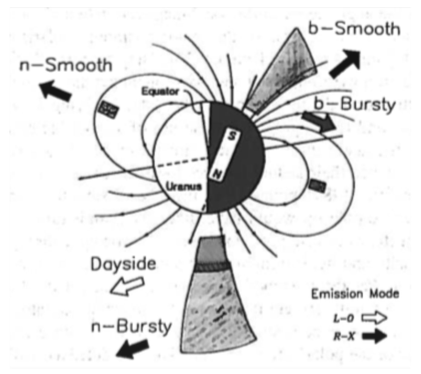La magnétosphère d’Uranus (comme celle de Neptune) héberge différents types d’émissions radio aurorales, portées par les lignes de champ magnétique (traits pleins), observées depuis les régions indiquées par des flèches. L’instrument radio de Voyager 2 a permis d’en localiser approximativement les principales sources en 1986 (régions grisées) au-dessus des pôles magnétiques mais aussi à l’équateur magnétique.