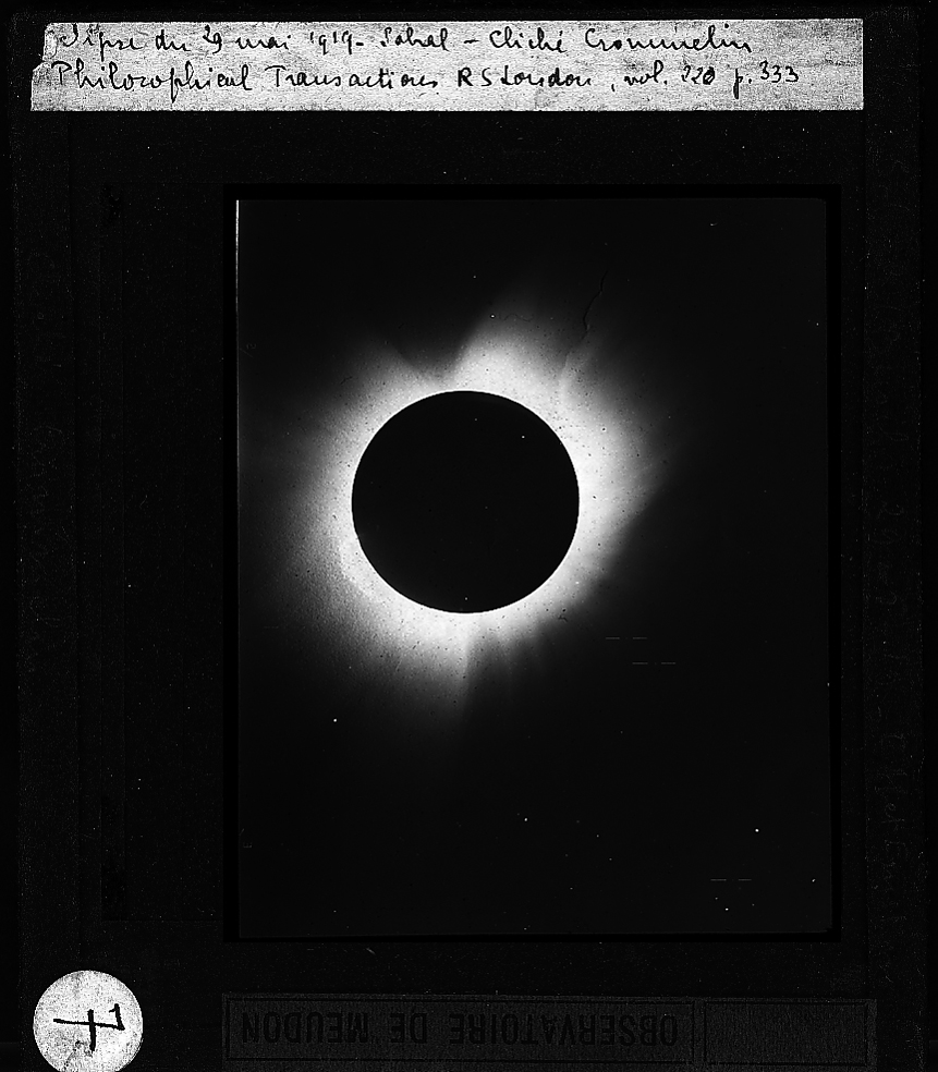 Le centenaire de l’observation de l’éclipse solaire du 29 mai 1919 par des astronomes britanniques fait l’objet d’un colloque scientifique de l’Union Astronomique Internationale organisé en partie à l’Observatoire de Paris du 27 au 29 mai 2019. A cette occasion, une copie sur plaque de verre d’un des clichés de cette observation historique a été retrouvée dans les collections de l’Observatoire, une découverte inattendue.