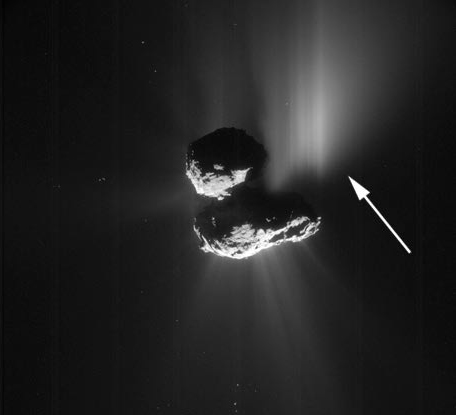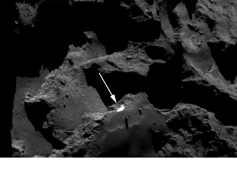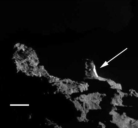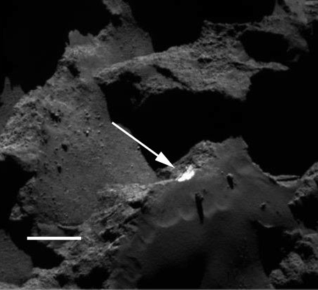 Cinq jours après le sursaut d’activité du 10 juillet 2015, grâce aux images du système d’imagerie OSIRIS, les chercheurs ont repéré une région très brillante et enrichie en glace d’eau fraichement exposée sur la paroi de la falaise de 134 m de haut, là où avant il y avait la fracture.