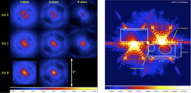 À gauche, images obtenues en 30 s de pose avec les trois coronographes en plan focal à travers les filtres étroits en bandes J, H et K pour un seeing de 0,7". À droite, image obtenue en 30 s de pose avec le coronographe vAPP en bande K avec un seeing de 0,7".