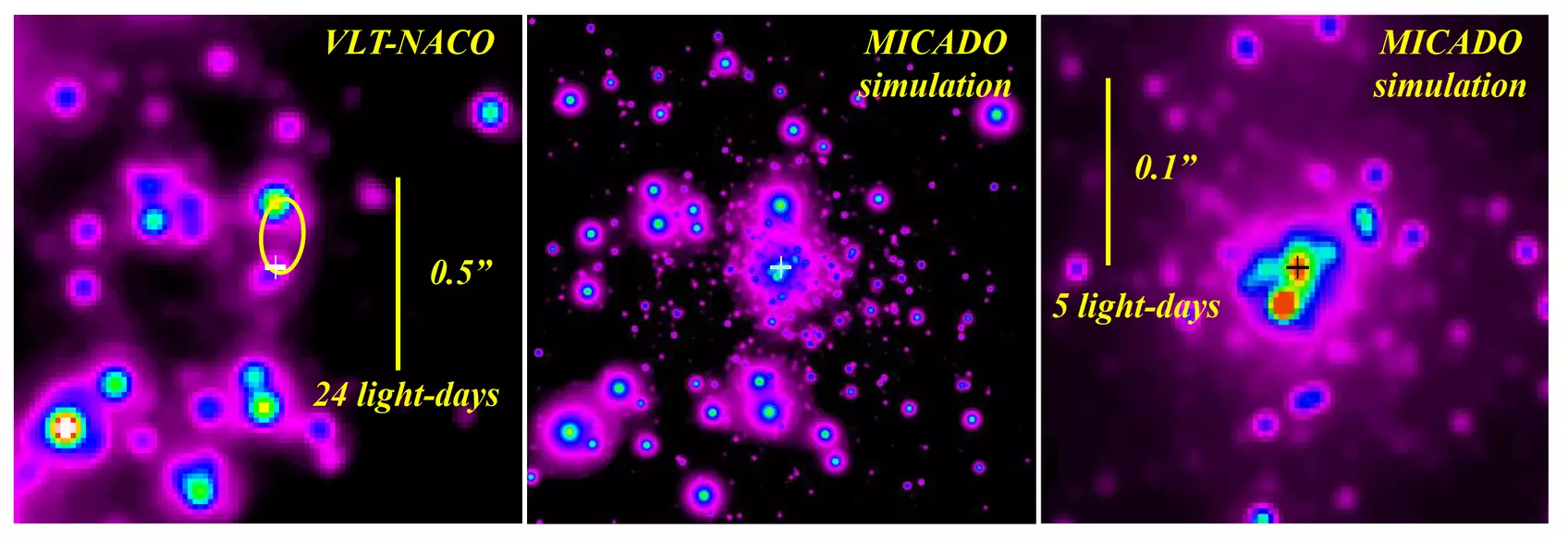 Ă€ gauche : observation par NACO au VLT de la seconde d’angle centrale du centre galactique, montrant l’orbite de l’Ă©toile S2 autour du trou noir supermassif. Au centre : simulation de ce qui pourrait ĂŞtre vu dans la mĂŞme rĂ©gion avec MICADO. Ă€ droite : zoom sur la rĂ©gion la plus interne, oĂą des Ă©toiles sur des orbites encore plus Ă©troites pourraient ĂŞtre observĂ©es.