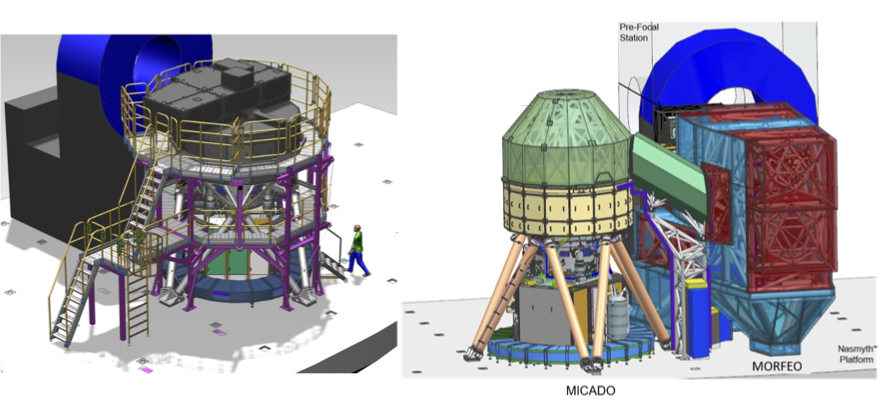 À gauche, MICADO dans sa configuration "stand-alone", prévalant à la première lumière. À droite, MICADO couplé à MORFEO.