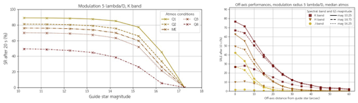 À gauche, performance sur axe de la boucle SCAO en bande K vs. la magnitude de la source de référence, calculée pour plusieurs conditions de turbulence. À droite, performance de la boucle SCAO en bande K vs. la distance à la source de référence, calculée pour plusieurs conditions de turbulence.