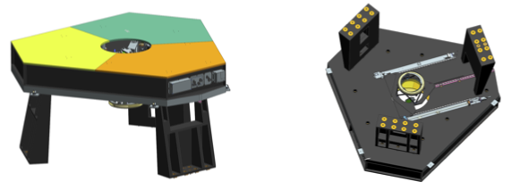 À gauche : vue de la structure Green Doughnut du module SCAO avec le banc optique, ses trois pieds, ses baffles extérieurs et son couvercle en trois parties. À droite, vue de dessous de la structure Green Doughnut du module SCAO avec la lame dichroïque SCAO, son support et ses rails de guidage.