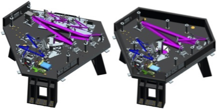 L’analyseur de surface d’onde et l’unitĂ© de calibration de la SCAO, en configuration de validation des performances de la SCAO (Ă gauche) et en configuration dĂ©ployĂ©e au tĂ©lescope (Ă droite). Le faisceau optique bleu est celui de l’analyseur de surface d’onde tandis que le faisceau magenta est celui de l’unitĂ© de calibration.