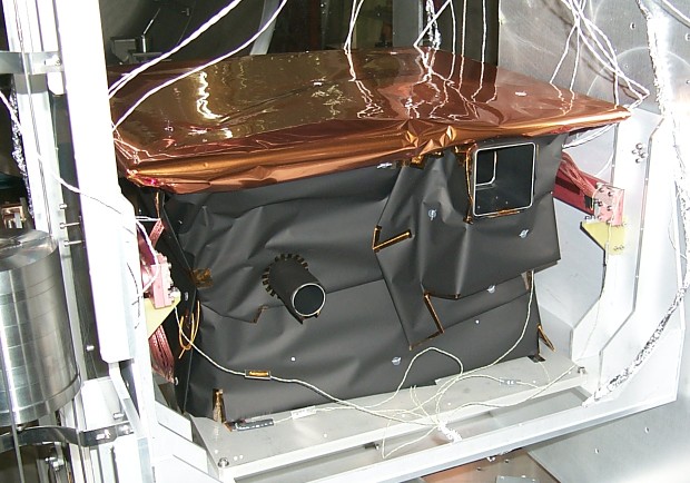 L’instrument est entourĂ© de ses protections thermiques. On distingue Ă gauche le baffle de la voie H, Ă droite celui de la voie M (CrĂ©dits : VIRTIS team)