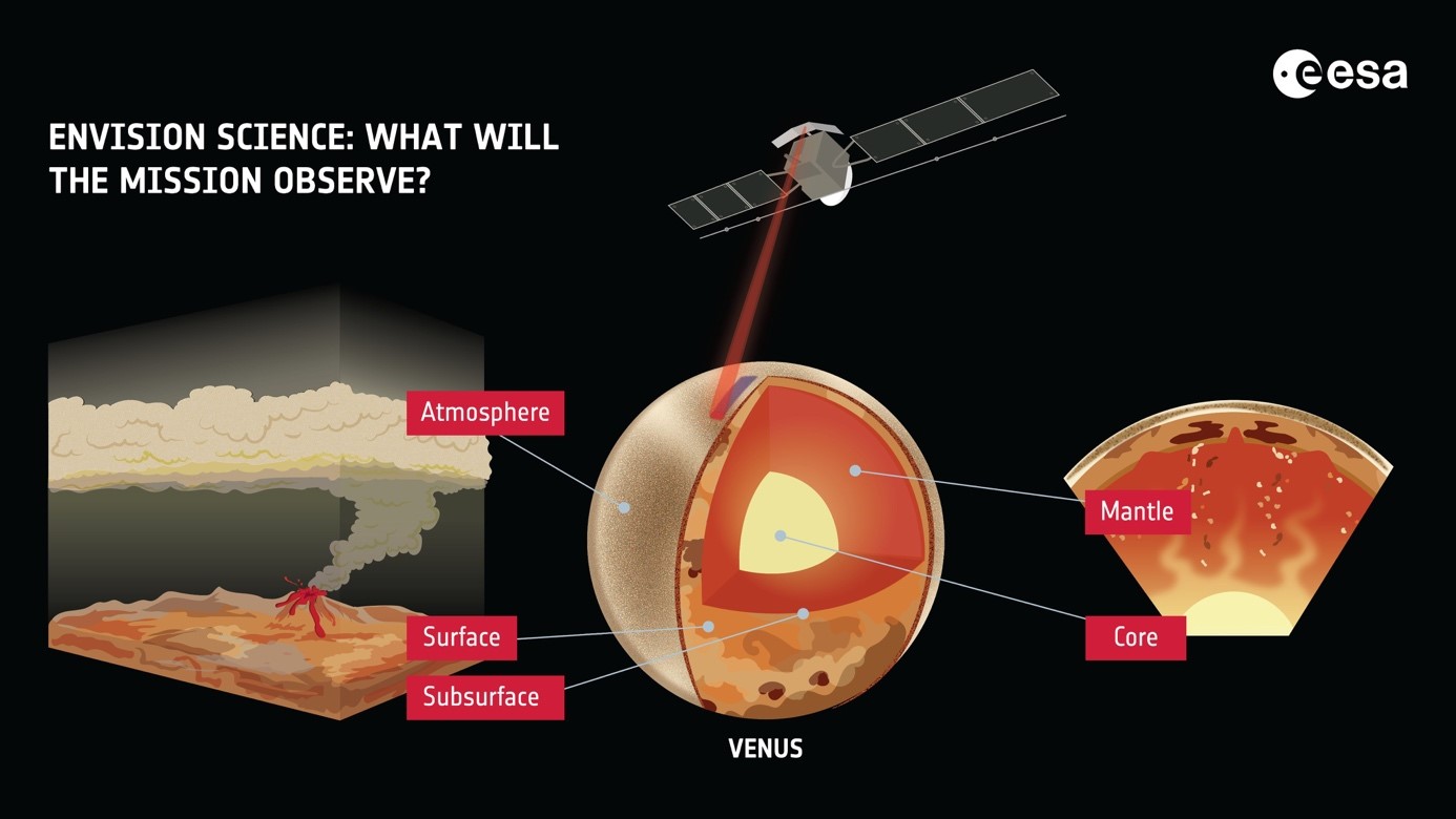 EnVision, conçue en partenariat avec la NASA qui en fournira l’instrument principal (le radar à synthèse d’ouverture VenSAR), révélera comment le volcanisme, la tectonique et plus généralement l’histoire géologique de la planète ont pu façonner la surface et l’atmosphère de Vénus jusqu’à aujourd’hui. Grâce à son orbite très basse, comparable à celle de l’ISS autour de la Terre, la mission explorera également l’intérieur de la planète, recueillant des données gravimétriques sur la structure et les caractéristiques du noyau, du manteau et de la lithosphère.