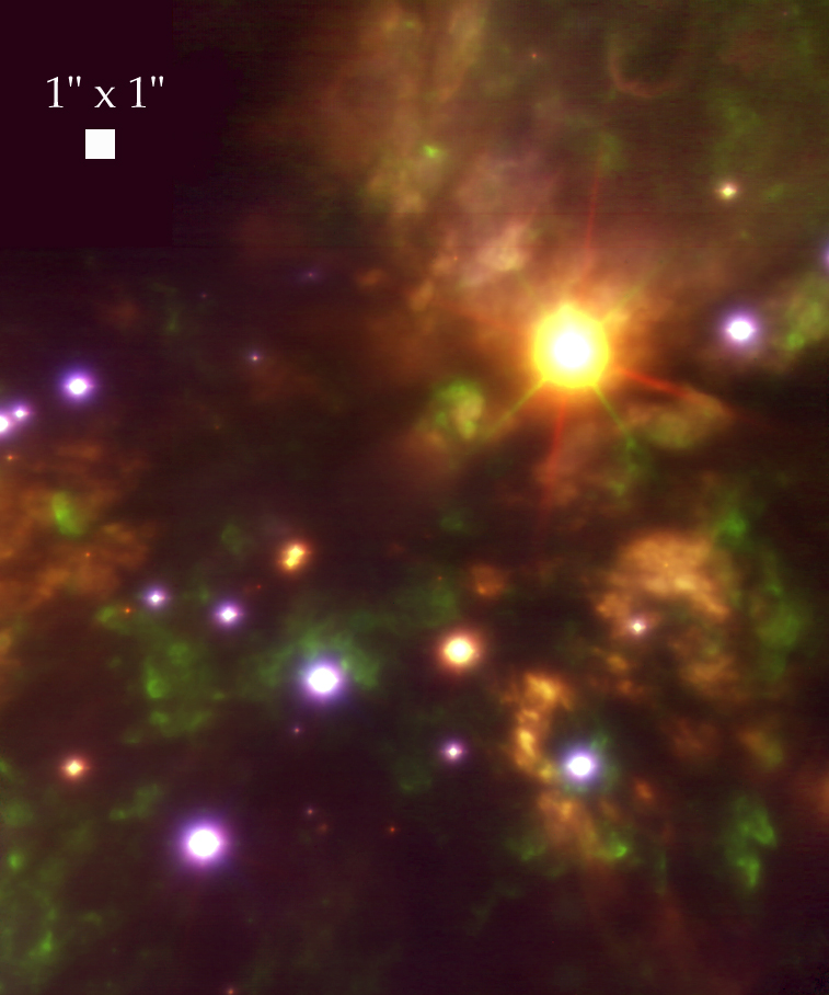 La rĂ©gion de Kleinmann-Low, situĂ©e autour de l’objet de Becklin-Neugebauer dans la grande nĂ©buleuse d’Orion est une rĂ©gion extrĂŞmement active du point de vue de la formation d’Ă©toiles : elle contient en particulier un amas stellaire très jeune, encore enfoui dans le cocon de gaz et de poussière oĂą il a vu le jour. Ce n’est que dans l’infrarouge que ces bĂ©bĂ©s-Ă©toiles peuvent ĂŞtre observĂ©es. La source la plus brillante est l’objet de Becklin-Neugebauer (BN) : c’est l’un des objets les plus Ă©tudiĂ©s dans la classe des proto-Ă©toiles, ces Ă©toiles qui n’ont pas encore atteint le stade oĂą les rĂ©actions de fusion nuclĂ©aire sont Ă©tablies, comme dans notre Soleil. L’image de NAOS ci-contre a permis d’Ă©tudier les Ă©jections de matière très importantes qui caractĂ©risent la phase proto-stellaire, ainsi que la formation des Ă©toiles de très petite masse qui apparaissent comme les sources les plus faibles sur cette image. Parmi ces sources, des "naines brunes" sont très certainement prĂ©sentes. Cette image a Ă©tĂ© obtenue en utilisant l’analyseur de surface d’onde infrarouge rĂ©alisĂ© par le LESIA Ă  l’Observatoire de Paris. La source BN a servi de "source de rĂ©fĂ©rence" Ă  l’analyseur.