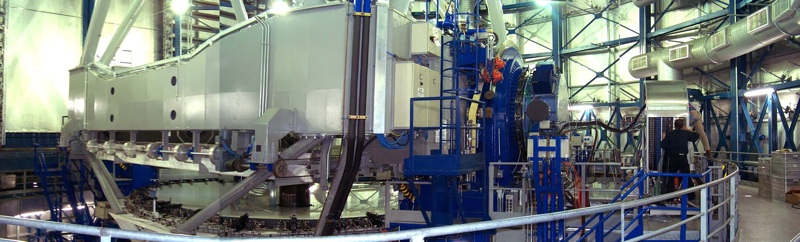 NAOS (la structure cylindrique bleue claire) installé au foyer Nasmyth de Yepun, le plus récent des quatre télescopes du VLT
