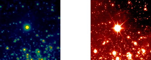 Les images ci-dessus illustrent le gain remarquable apportĂ© par l’optique adaptative NAOS en comparant la photo d’un mĂŞme objet, l’amas stellaire dense NGC 3603 dans la constellation de la Carène, obtenue avec la camĂ©ra ISAAC du VLT (sans optique adaptative) et avec NAOS/CONICA. Le nombre d’Ă©toiles dĂ©tectĂ©es, en particulier les Ă©toiles de très faible Ă©clat, est très supĂ©rieur sur l’image obtenue avec NAOS/CONICA : cela permet une Ă©tude dĂ©taillĂ©e de la façon dont les Ă©toiles se rĂ©partissent, depuis les faibles jusqu’aux très grandes masses, lors du processus de formation stellaire. Cette rĂ©gion est particulièrement intĂ©ressante de ce point de vue, car elle est le siège d’une activitĂ© de formation stellaire parmi les plus intenses de notre Galaxie.