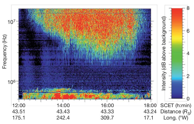 L’intensité des émissions est tracée en fonction du temps de réception (SCET) et de la fréquence (de 500 kHz à 16 MHz en échelle logarithmique). Les coordonnées de Cassini (distance au centre de Saturne en rayons planétaires . RS-, et longitude en °) sont indiquées en abscisse. Cassini se trouvait dans le plan équatorial à un temps local de 18.6 h. L’instrument radio de Cassini - RPWS (Radio and Plasma Wave Science) - est dans la gamme spectrale concernée un spectromètre à balayage de fréquence. Il détecte les éclairs, intrinsèquement large bande, aux fréquences balayées lors de leur occurrence. La limite basse fréquence est fixée par l’ionosphère de Saturne, qui emprisonne les émissions radio atmosphériques de fréquence plus basse que sa fréquence de plasma maximum locale. Les éclairs étaient si nombreux (5 à 10 / seconde) qu.ils se superposent et ne sont plus résolus vers le centre de l’intervalle représenté, tandis que des événements individuels restent discernables sur les bords. L’émission au dessous de 800 kHz est l’émission radio magnétosphérique aurorale de Saturne.