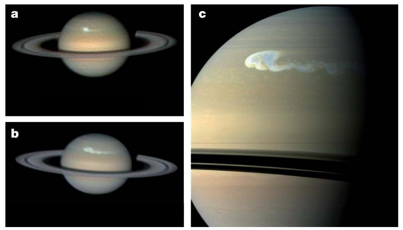 c, Image prise le 24 Décembre 2010 avec la caméra à grand angle de Cassini. Le centre de l’orage est à 288° de longitude W et son extension latitudinale et longitudinale atteint respectivement 10000 km et 17000 km, avec une traînée qui s’étend bien plus loin vers l’Est.