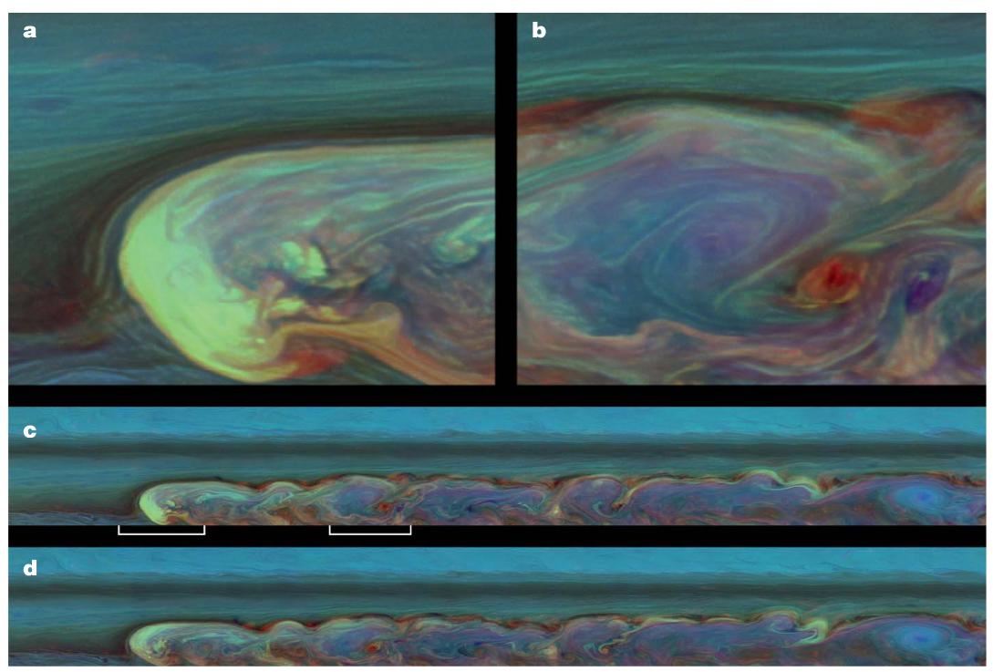 d, Image de l’orage 11h après l’image c, permettant de discerner une évolution morphologique. Les images ont été prises par la caméra à téléobjectif de Cassini le 26 Février 2011 d’une distance de 2,4 millions de km.