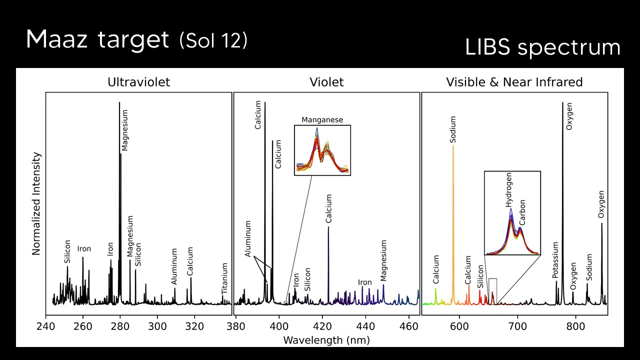 Depuis l’atterrissage le 18 février 2021, les ingénieurs et chercheurs ont testé les cinq fonctionnalités de SuperCam au cours des jours martiens (appelés “Sols”). Ils ont notamment visé une roche, baptisée “Máaz”, qui signifie Mars en indien Navajo.