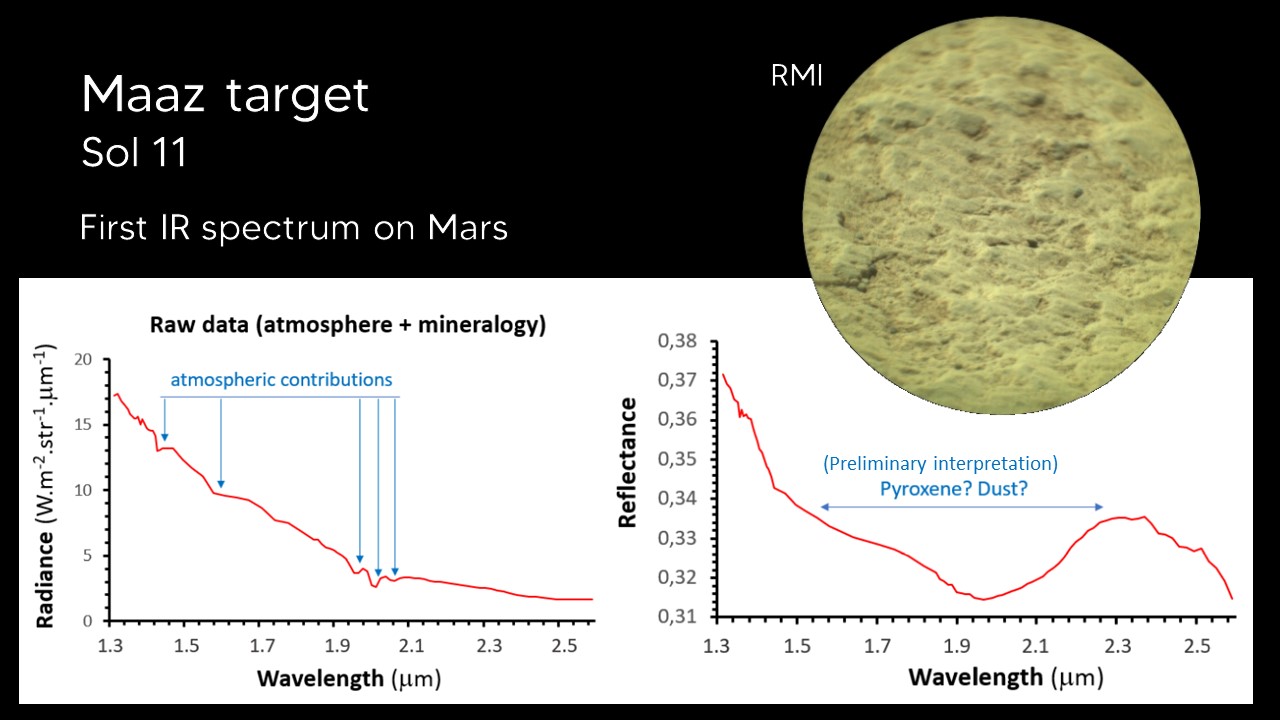 La spectroscopie laser LIBS (Sol 12, Fig. 4) et la spectroscopie infrarouge (Sol 11, Fig. 5) ont montré qu’il s’agissait d’une roche basaltique commune sur Mars.