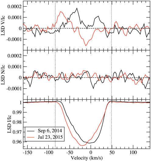 Mesure du champ magnétique (en haut), test de la pollution de la mesure (au milieu), et profil moyen des raies spectrales de HD188774, à deux dates différentes. La signature non nulle visible dans le panneau du haut indique que l’étoile est magnétique.