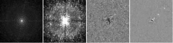 De gauche Ă droite : image de l’Ă©toile corrigĂ©e par optique adaptative, image de l’Ă©toile attĂ©nuĂ©e par coronographie, imagerie diffĂ©rentielle Ă 2 bandes spectrales, imagerie diffĂ©rentielle angulaire. Cette simulation est faite pour une Ă©toile jeune (10Myrs) de type M0V, et pour des planètes de 1MJ (situĂ©es sur la diagonale).