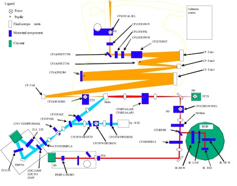 Le trajet orange montre l’optique commune incluant l’optique adaptative. Les faisceaux rouge reprĂ©sente la voie IR oĂą se situe le coronographe et les 2 instruments IR (IRDIS et IFS). Enfin le trajet bleu montre l’analyseur de surface d’onde de l’optique adaptative et l’instrument ZIMPOL. crĂ©dits consorium SPHERE.