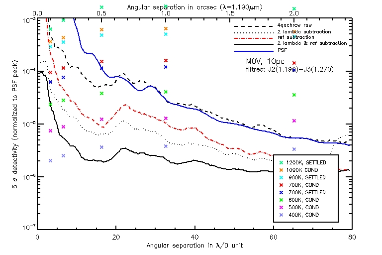 Les courbes correspondent aux diffĂ©rents niveaux de traitement dĂ©crit prĂ©cĂ©demment (paragraphe CaractĂ©ristiques Instrumentales). Les croix de couleurs correspondent Ă diffĂ©rentes tempĂ©ratures de planètes. Les croix situĂ©es au dessus d’une ligne sont dĂ©tectables.