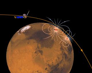 La " planète rouge " possède une atmosphère ténue de dioxyde de carbone mais elle est dépourvue de champ magnétique propre. Quelques " anomalies " magnétiques ont été mesurées à la surface de Mars par une sonde spatiale, mais elles ne permettent pas la production d’émissions aurorales. Comme pour Vénus, le contact est direct entre le vent solaire et l’atmosphère de la planète.