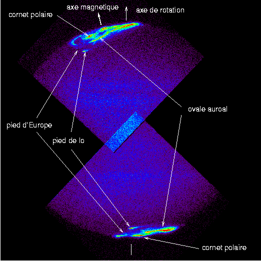 Les lignes de champ magnétique qui balayent les atmosphères très ténues et conductrices des satellites galiléens, Io, Europe, Ganymède, donnent lieu à des courants alignés qui permettent la précipitation de particules chargées dans la haute atmosphère de Jupiter. On peut alors observer les émissions situées au pied de ces lignes de champ sur la planète dans les deux hémisphères de Jupiter (voir la mosaïque des deux images UV en fausses couleurs réalisées par le télescope saptial Hubble ).