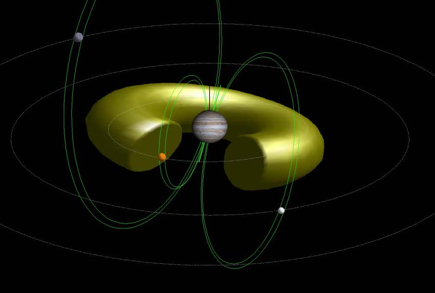 Les ovales auroraux joviens sont bien produits par des précipitations de particules chargées, mais les courants alignés qui en sont à l’origine, ne sont pas produits par l’effet du vent solaire comme sur Terre. Jupiter possède un disque de plasma équatorial alimenté en particules chargées par le volcanisme actif de Io (voir photo de Io), le plus proche satellite galiléen. La partie extérieure de ce disque ne tourne pas de façon rigide avec la planète et son champ magnétique. Un effet, dû cette fois de rotation rapide du disque par rapport au champ magnétique de Jupiter, se produit dans cette région balayée par les lignes de champ, créant ainsi les courants alignés. Les lignes de champ magnétique qui balayent les atmosphères très ténues et conductrices des satellites galiléens, Io, Europe, Ganymède, donnent lieu à des courants alignés qui permettent la précipitation de particules chargées dans la haute atmosphère de Jupiter. On peut alors observer les émissions situées au pied de ces lignes de champ sur la planète dans les deux hémisphères de Jupiter (voir la mosaïque des deux images UV en fausses couleurs réalisées par le télescope spatial Hubble).