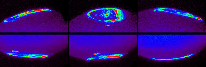 Contrairement à la Terre, les ovales auroraux de Jupiter "suivent" la planète au cours de sa rotation. Les images UV (représentées en fausses couleurs) ont été réalisées par la caméra STIS (Renée Prangé).