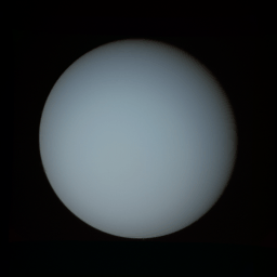 Uranus est une planète gazeuse dont l’axe de rotation est presque situé dans le plan de son orbite. A l’époque de la rencontre de la sonde Voyager 2 en 1986, l’axe de rotation formait un angle de 8 degrés avec la direction du Soleil. La planète possède un champ magnétique, mais contairement aux autres planètes magnétisées où l’axe de rotation forme un angle de quelques degrés, il atteint 60 degrés pour Uranus. L’axe de rotation décrit un cône très ouvert permettant la formation d’une magnétosphère différente de celle des planètes précédentes. La sonde Voyager 2 ne possédait pas de caméra fonctionnant dans l’ultraviolet mais d’un spectrographe muni d’une fente d’entrée avec lequel des balayages de la planète ont été effectués pour détecter des émissions. La carte en projection ci-dessous montre la répartition des émissions aurorales sur la planète.