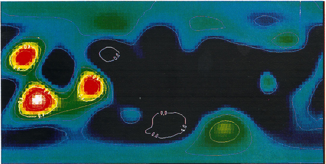 Les emissions brillantes en rouge et blanc à gauche sont près du pôle nord magnétique. L’emission jaune-verte en bas à droite est localisée près du pôle sud. Avec l’autorisation de B.R. Sandel, F. Herbert et A.J. Dessler ; Geophysical Review Letters.