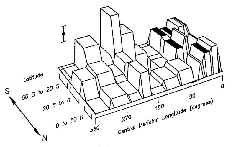 Le plus grand pic d’emission est situé au pied du pôle sud magnétique. Les emissions entre 0 et 80 degrés de longitude sont localisées aux pieds de lignes de champ magnétique à plus basses latitudes que le pôle nord magnétique. Avec l’autorisation de B.R. Sandel, F. Herbert et A.J. Dessler ; Geophysical Review Letters.
