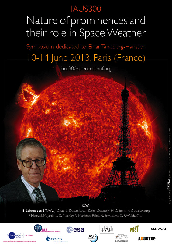 Le symposium IAU 300 « The Nature of prominences and their role in Space Weather » se tiendra Ă Paris du 10 au 14 Juin 2013 Ă l’Ecole de Chimie.